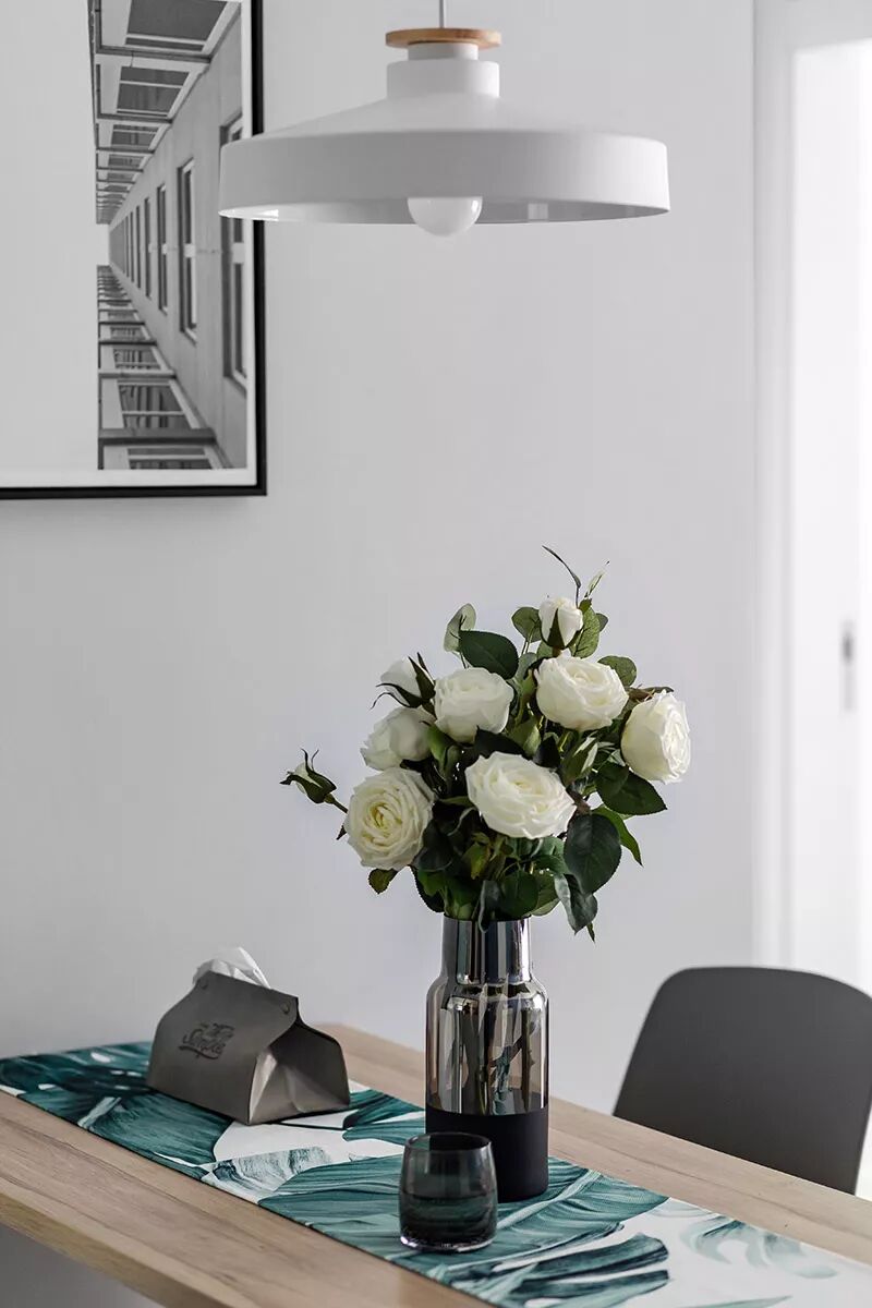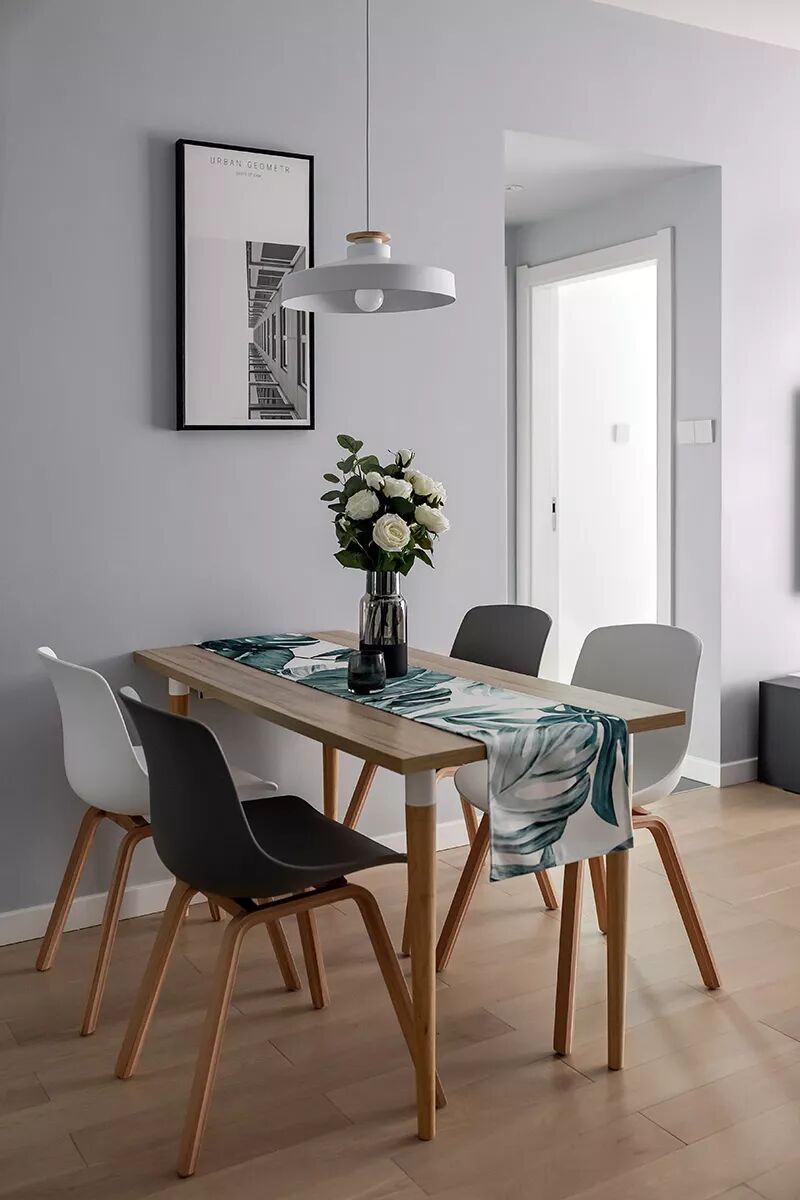 ▲餐桌台面垫上桌旗,摆上一盆鲜花,为空间注入了一丝清新优雅的气质。