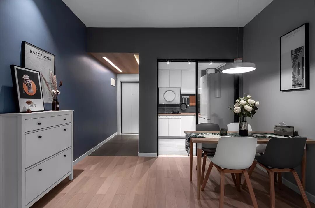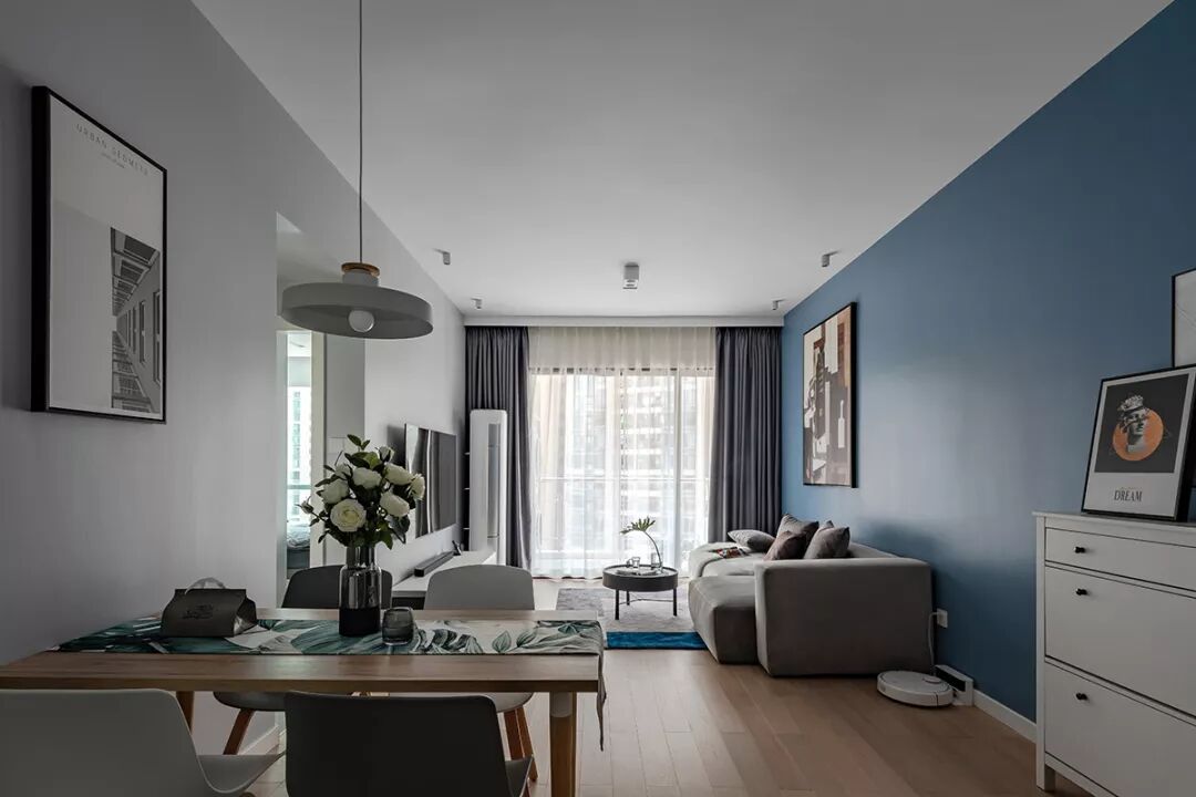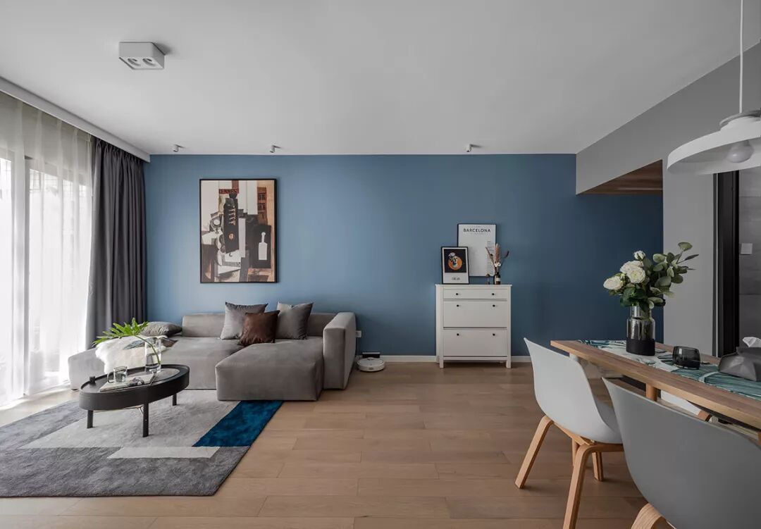▲蓝色的沙发墙贯穿到玄关,挂上一大幅画,结合灰色布艺沙发,地面还垫着简约灰色的地毯,沙发侧边还有个小斗柜,整体空间设计显得安静优雅好舒适。