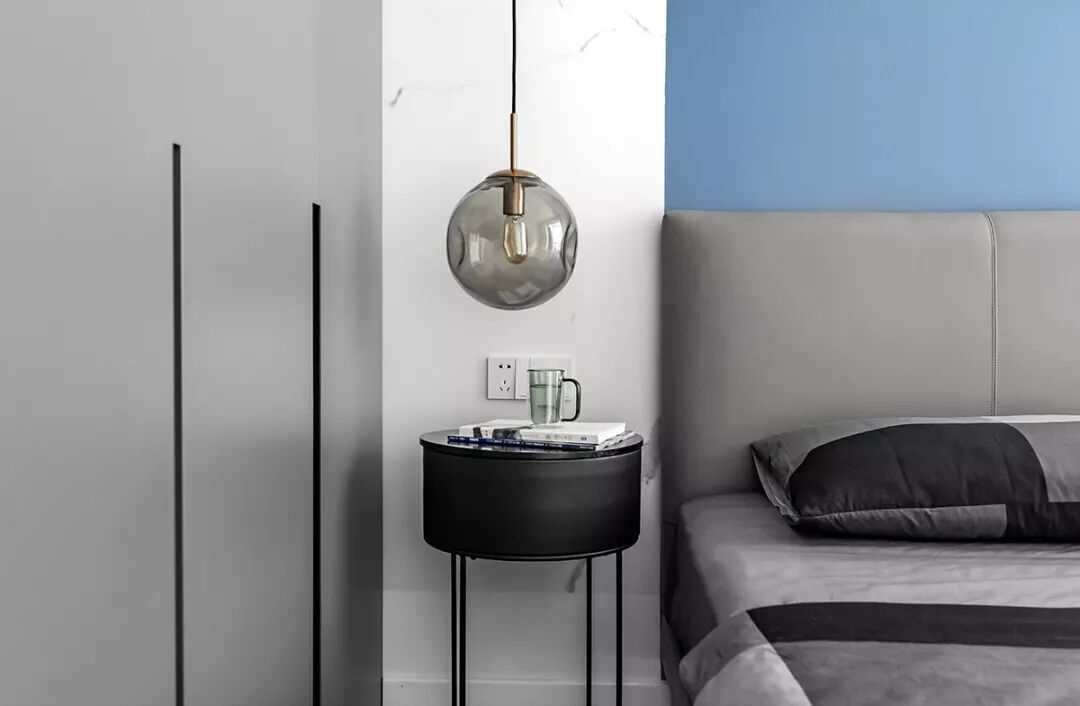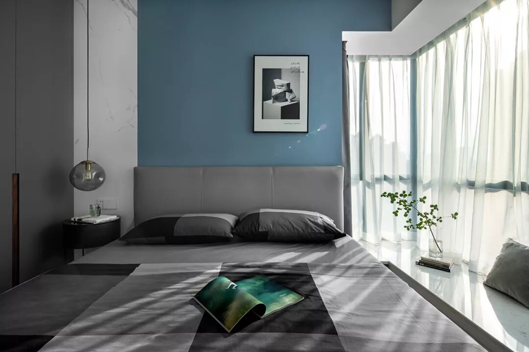 ▲卧室空间也是以现代舒适为主,蓝色床头墙+灰色床铺与衣柜,蓝灰配的格调,现代年轻好自然。