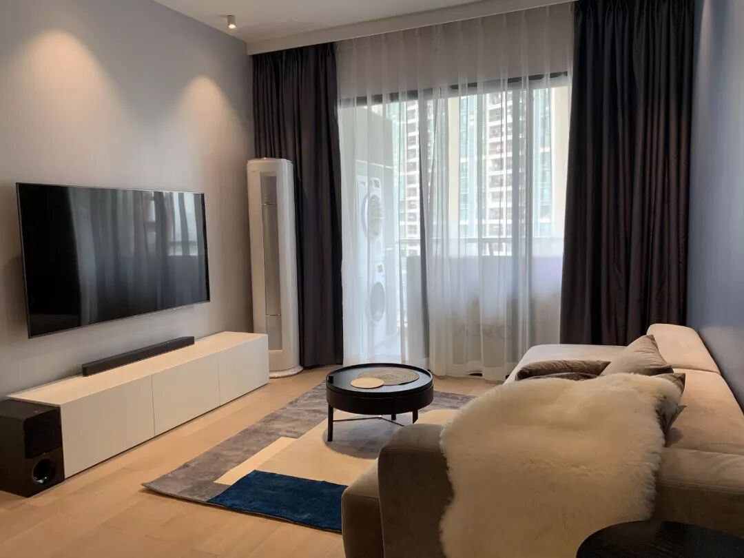▲电视墙布置一个白色电视柜+壁挂电视机,简洁的布置也不失优雅气质。
