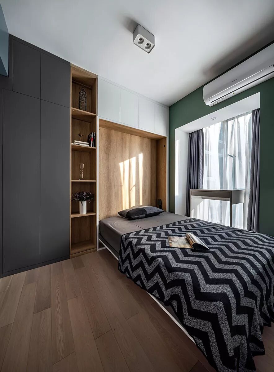 ▲这张隐形的床铺,展开后就有一个灵活实用的卧室休闲空间了。