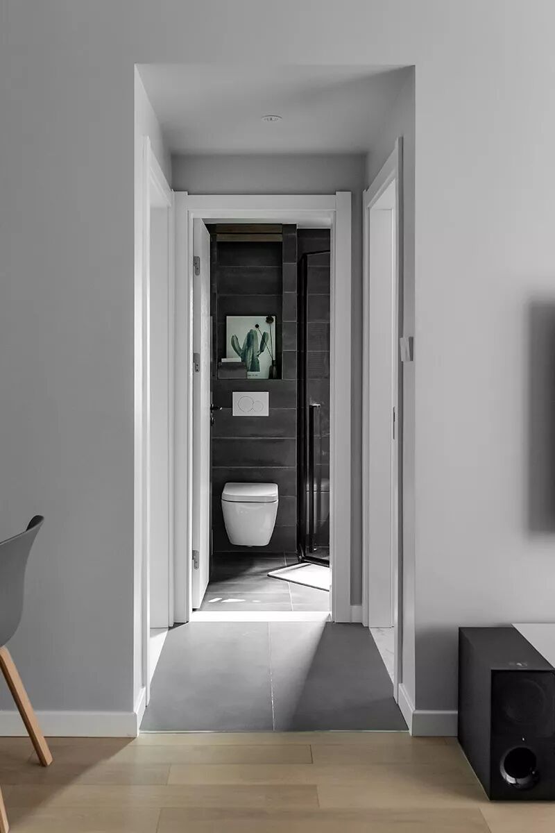 ▲灰色调的空间,走廊区域地面铺着灰色亚光砖,走廊尽头是卫生间的门。