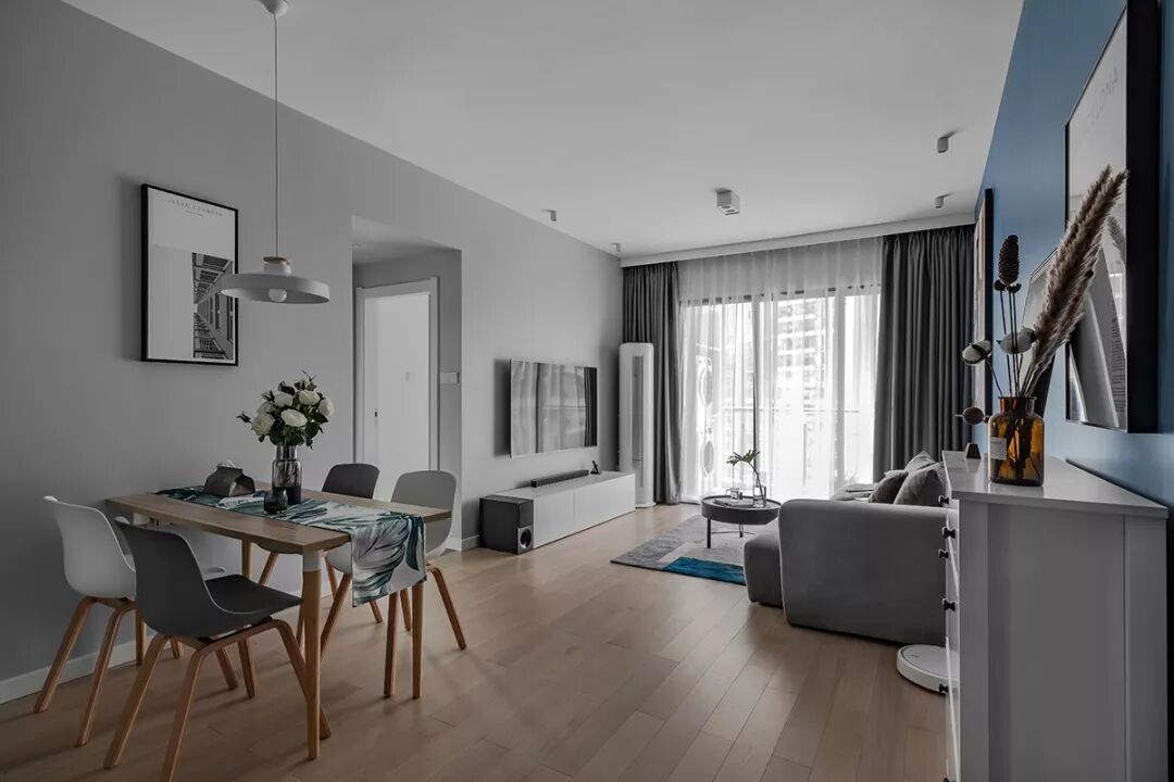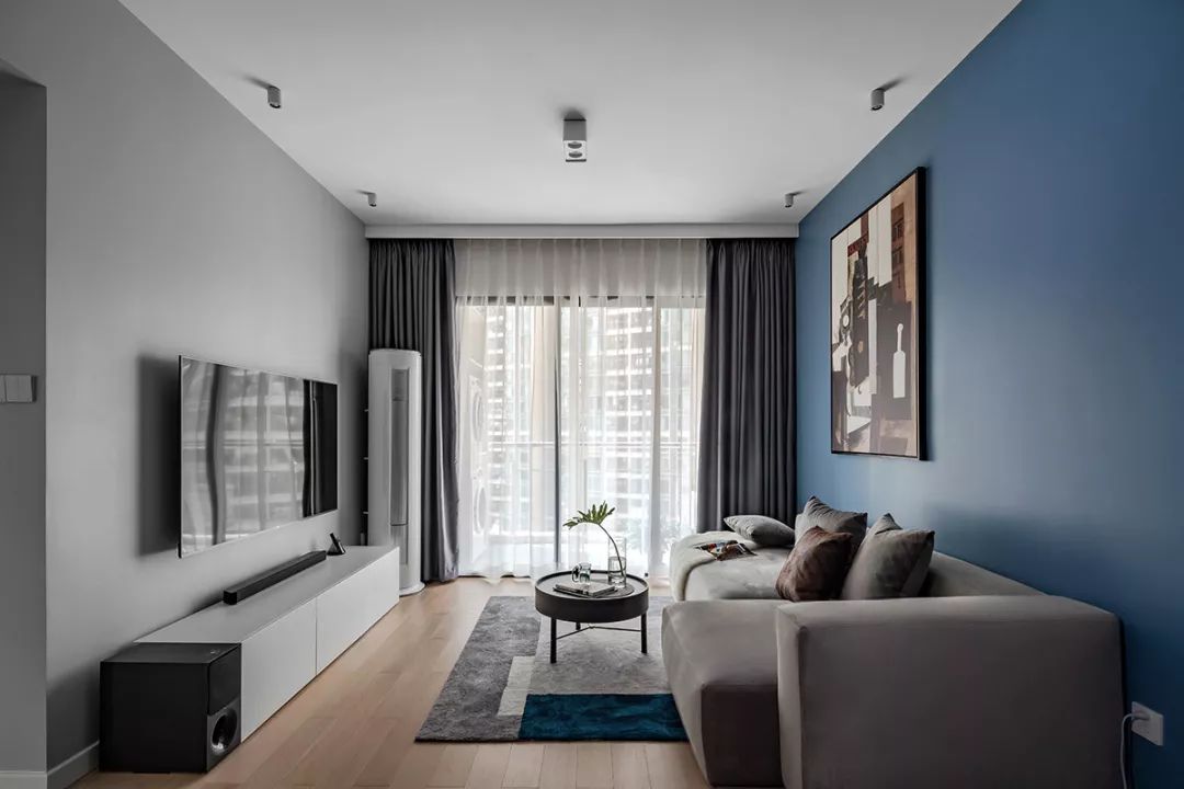 ▲客厅在灰色电视墙+蓝色沙发墙,搭配木质地板,整体简约自然的家具布置,营造出一种现代轻松的大气。