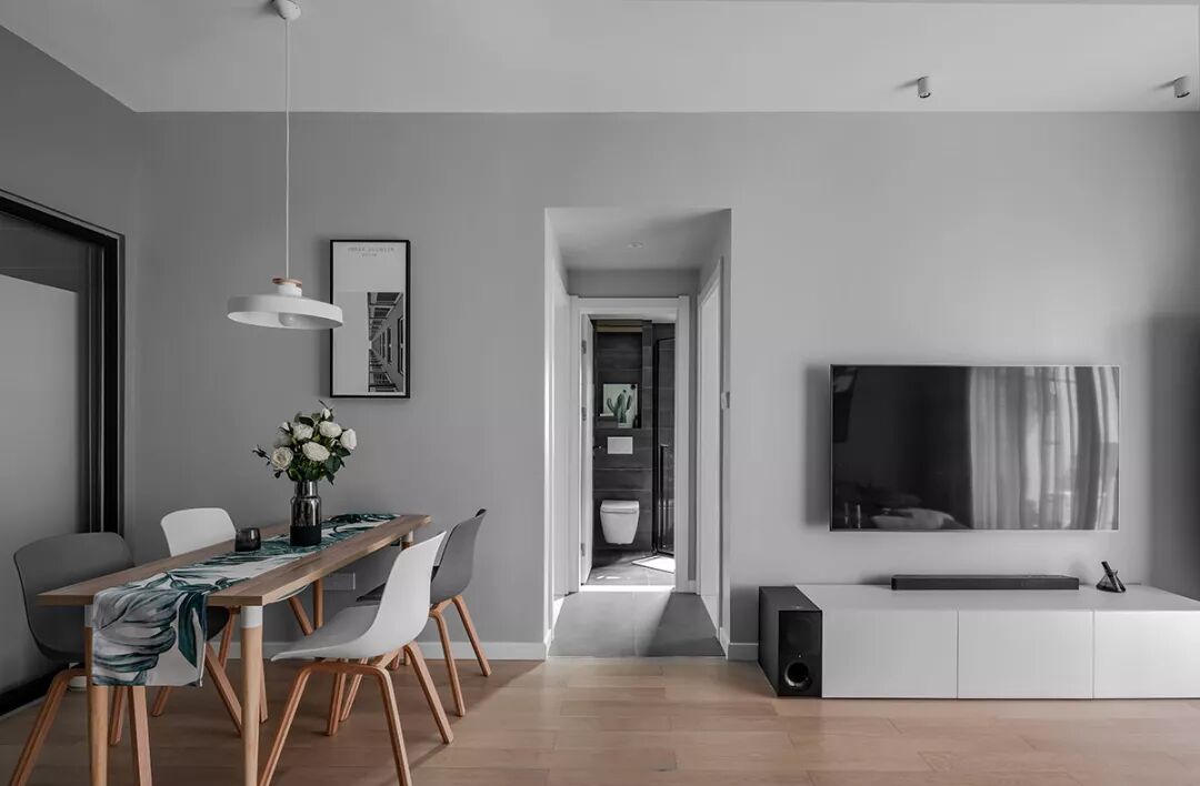 ▲简洁的木质餐桌,搭配灰白配的餐椅,在灰色墙面空间搭配下,挂上一幅简约自然的装饰画,还有一盏独特文艺的吊灯,带来的是一个舒适轻松的用餐氛围。