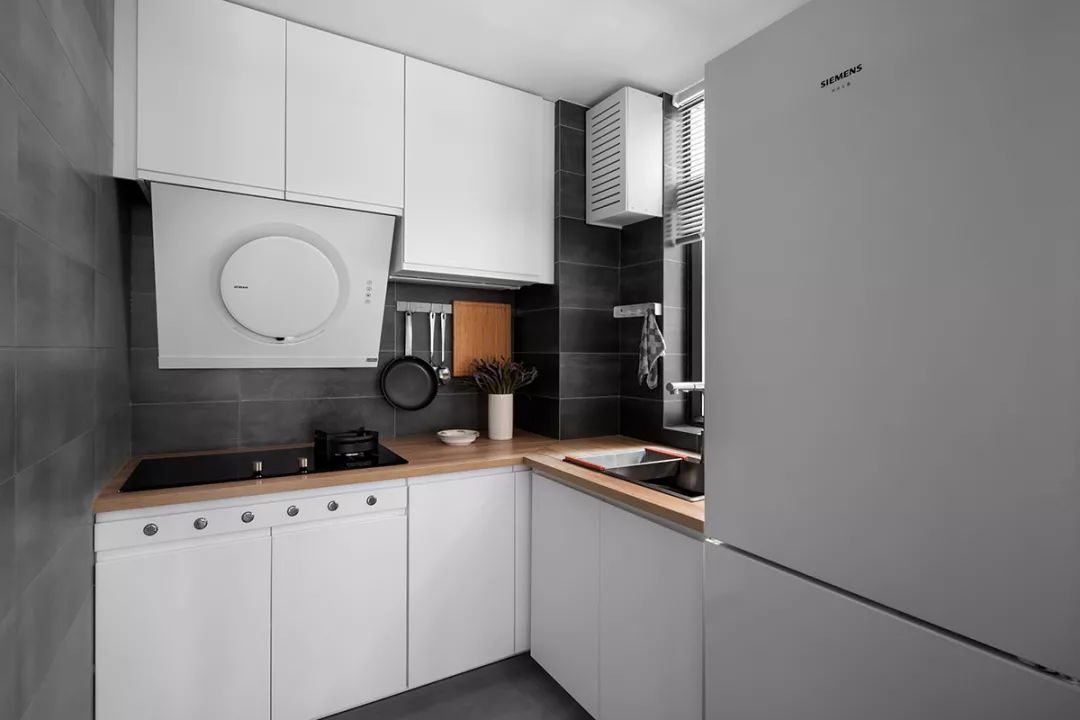 ▲灰色调的地面墙面基础,白色橱柜+木色的操作台面颜色,整体空间小巧文艺、实用自然。