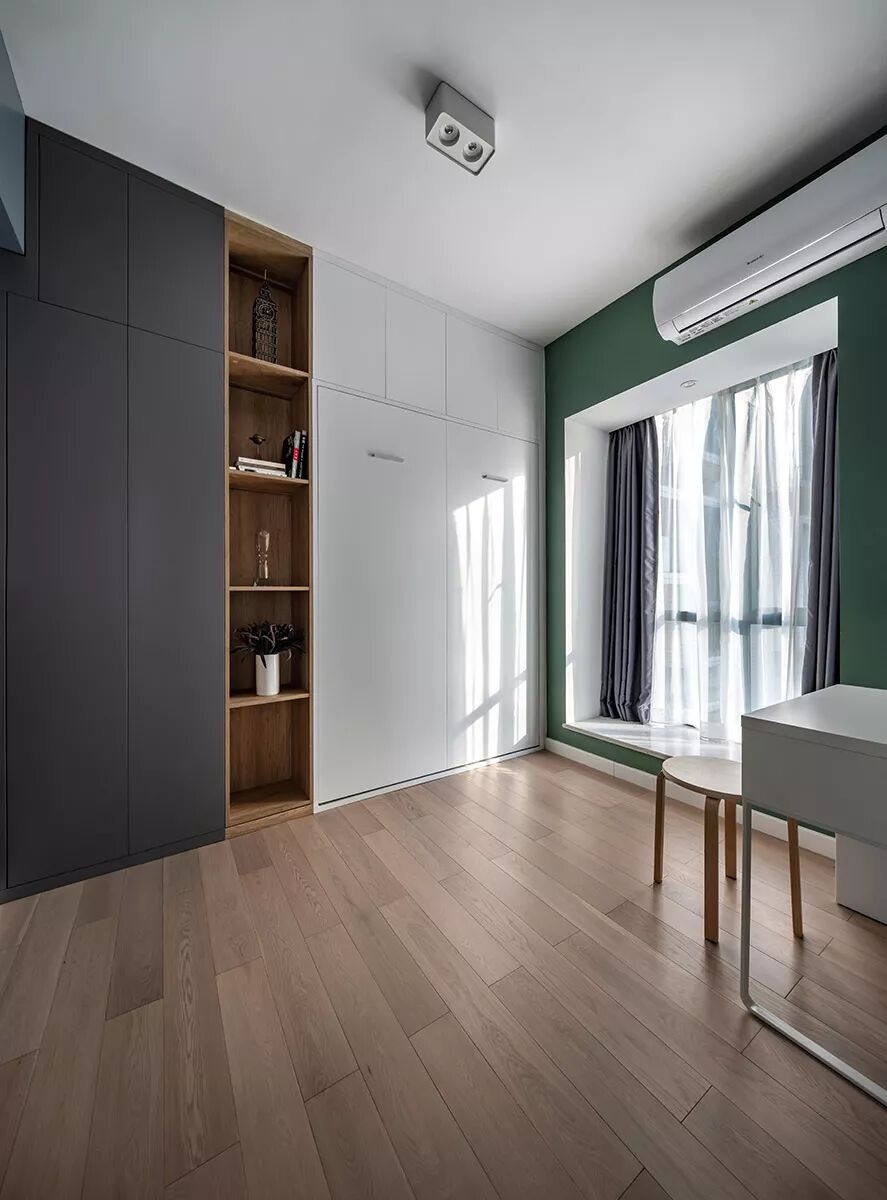 ▲书房摆上一套简洁的书桌椅,墙面的收纳柜也藏入了一个收纳柜+隐形床,整体简洁的空间也灵活。