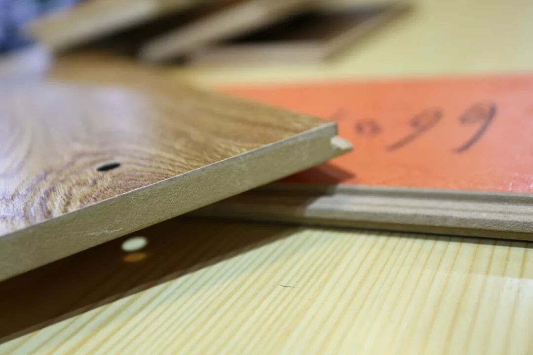 强化复合地板:装饰纸+密度板(打碎的木粉)