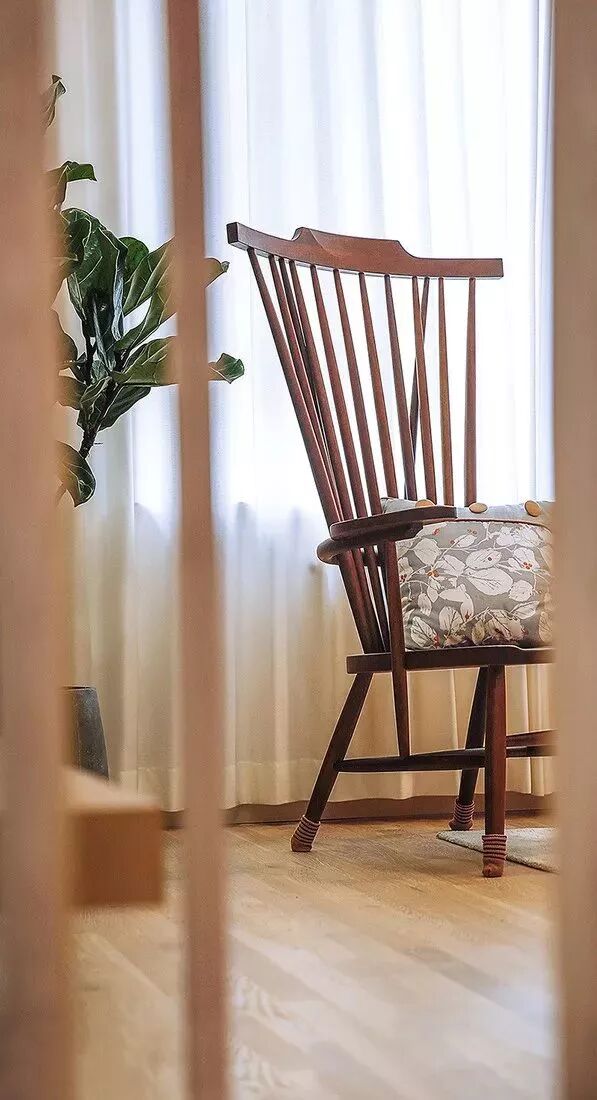 ▲ 颇具线条美感的木椅临窗而立,一侧便是轻盈曼妙的琴叶榕,自然舒适又清新。