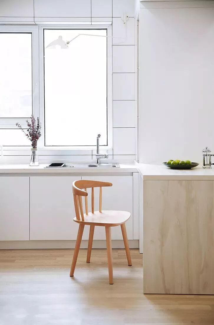 ▲ 整个空间业主最喜欢的设计就是通透的开放式厨房,以白色为主调的空间干净敞亮,U型设计最大程度的利用了空间。
