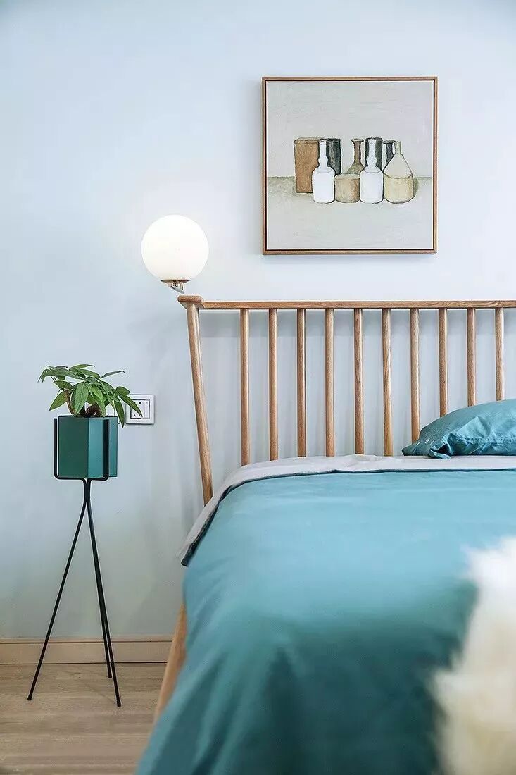 ▲ 未设置传统的床头柜,而是用简易的小支架搭配小盆绿植,别有一番美感。