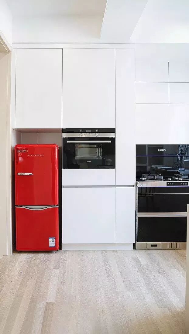 ▲ 纯白空间里,冰箱的一抹亮丽的红让人猝不及防,惊艳十足。嵌入式的设计整齐利落,大写的赞。
