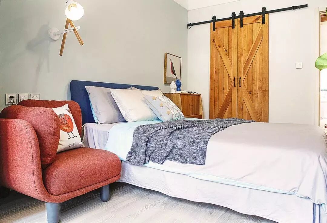 ▲ 主卧风格清新雅致,嵌入式的衣柜选用了造型古朴的谷仓门,红色沙发复古气息十足,颜值爆表,搭配上方的床头灯,满满的时尚感,营造超有格调的阅读区。
