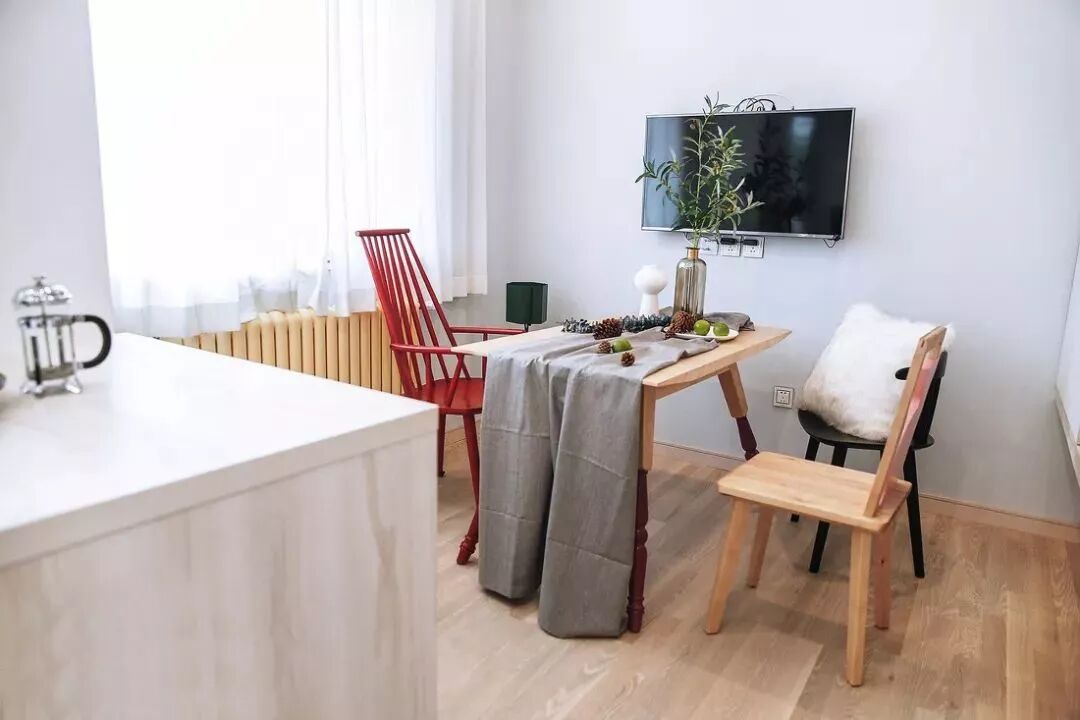 ▲ 餐厅色调清新,浅灰色桌布搭配木质餐桌,营造慵懒舒适的用餐空间。三只款式色系不一的餐椅摆放在一起,随性又有趣。