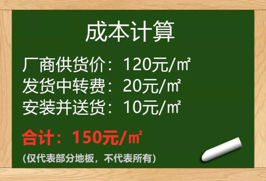 地板仅前期付出成本就150元/㎡,再加上我的店铺租金、仓储费、人工费、水电费、售后服务,这些算在一起至少160元/㎡,我卖你170元最多最多赚10块钱!