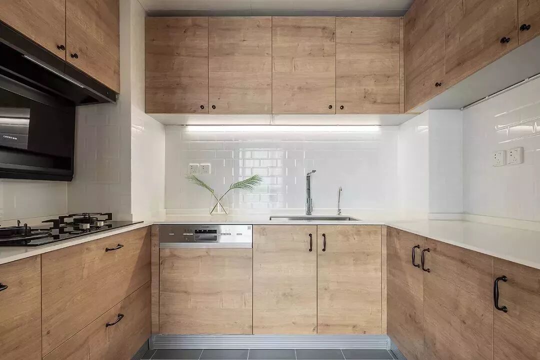 ▲U形格局的厨房,在灰色地砖基础,搭配木质橱柜面板与白色的墙面砖,营造出一个文艺舒适的烹饪空间,做饭的心情都显得轻松闲适。