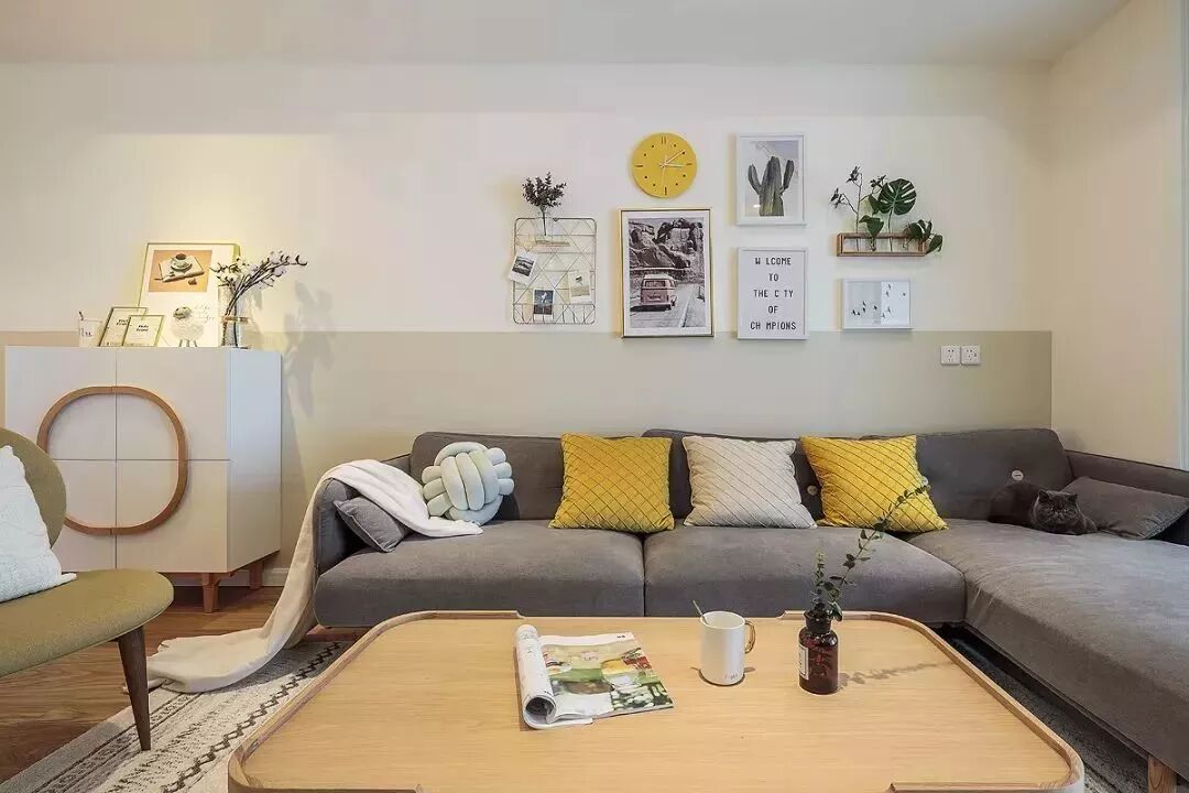 ▲沙发墙是暖灰色墙脚+白色墙身的双色搭配,在上方墙身挂上一组简约的装饰画,搭配灰色布艺沙发与精致的软饰,整个空间充满了简约舒适的气息。