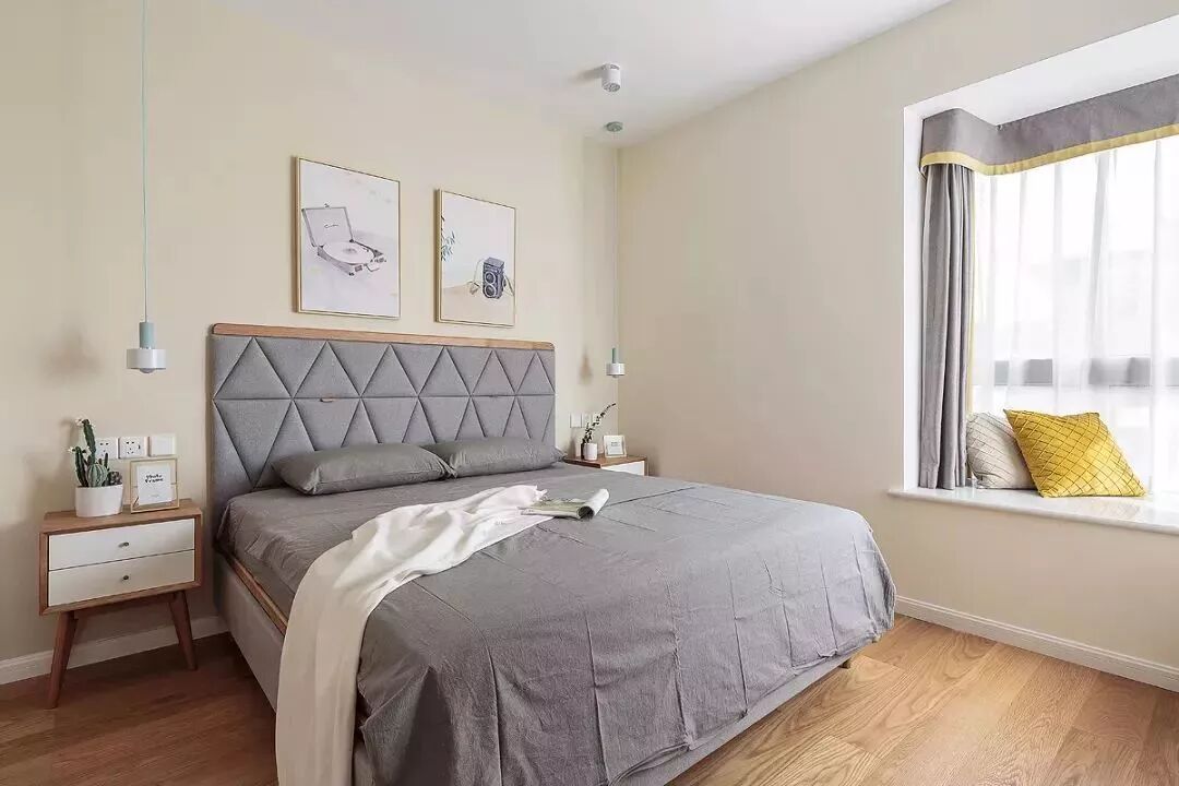 ▲主卧暖色调的墙面空间基调,搭配灰色布艺床,床的靠背是舒适的布质,墙面两幅简约装饰画,还有2个木色柜身+白色门的床头柜,还有情调舒适的休闲飘窗,简单的空间布置营造出温馨舒适的画面。