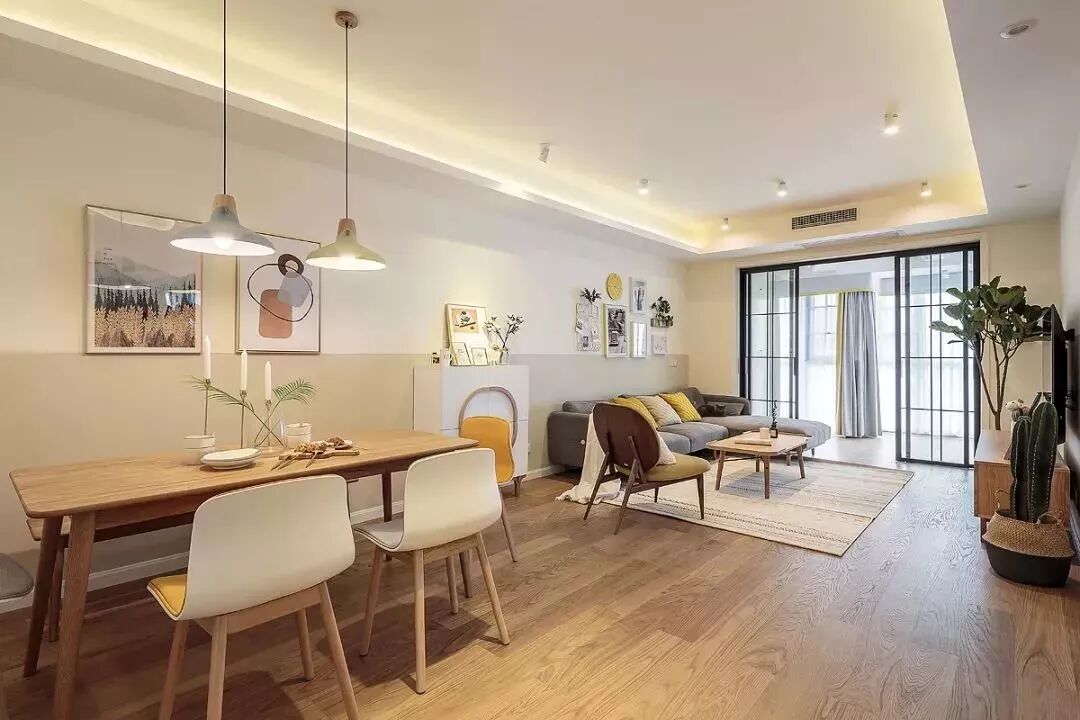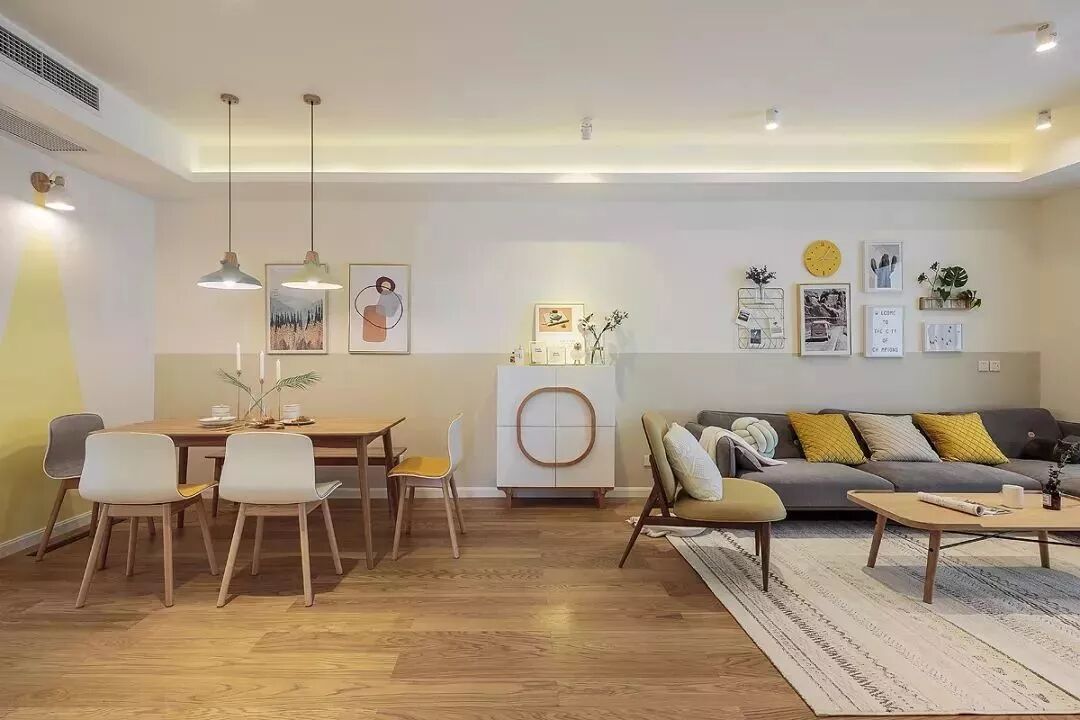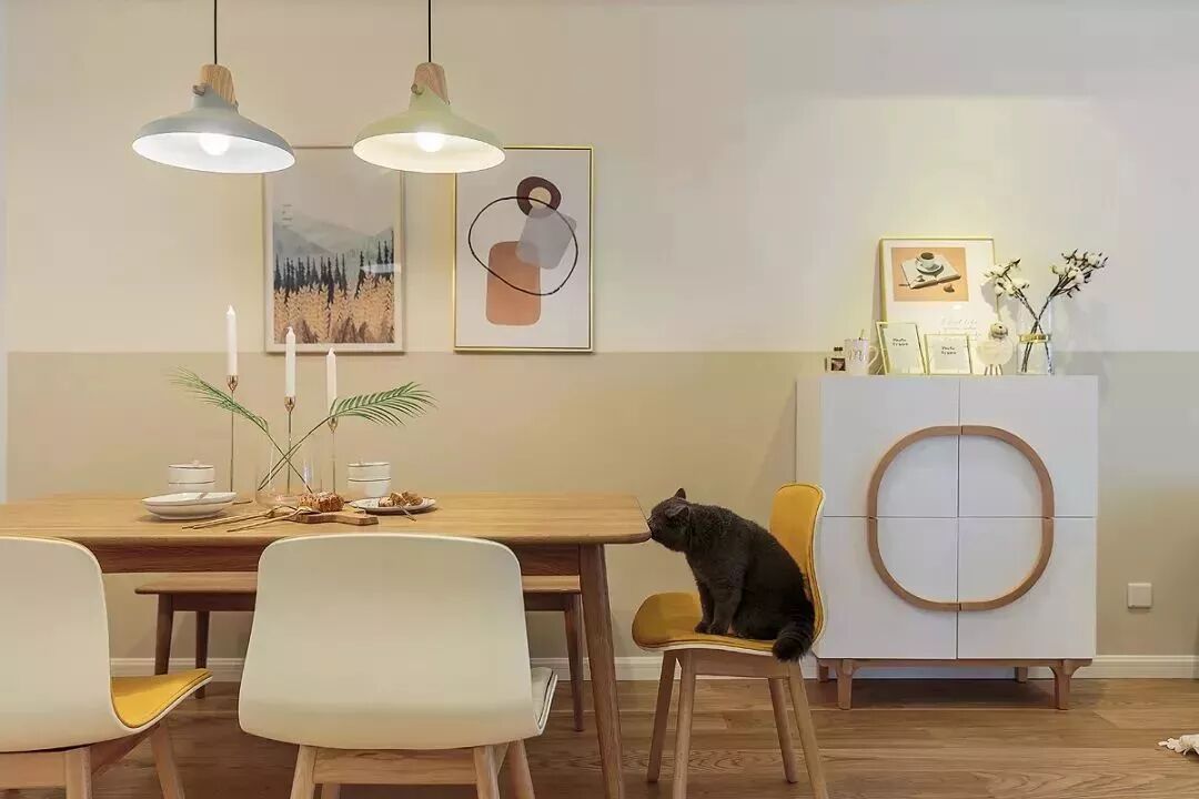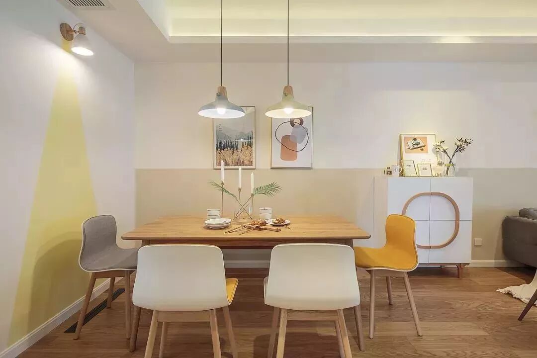 ▲餐厅背景墙挂上两幅简约的装饰画,搭配原木餐桌,灰黄配座椅,还有两张灰黄配的吊灯,呈现出一个温馨自然的空间感。
