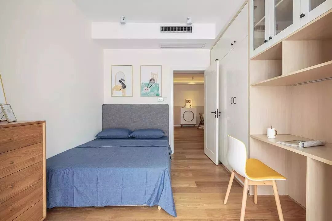 ▲次卧通透的布局还床与书桌衣柜布置成2排,木质与白色的空间色调,搭配蓝灰色的床,带来舒适自然的空间感。