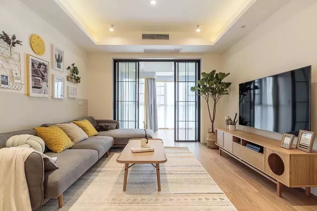▲简洁的电视墙布置上木质电视柜,靠窗一盆琴叶榕绿植,营造出原始自然的清新感。