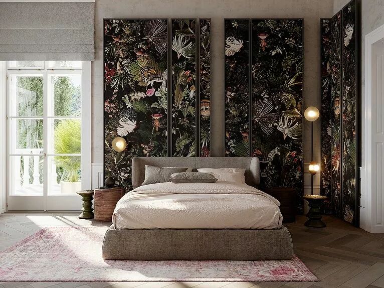 繁花簇锦的卧室背景画,高贵又浪漫,在橘黄的灯光下,折射出炽热的情感。