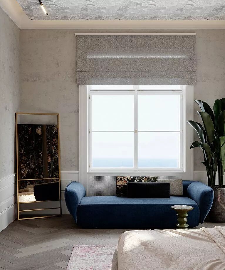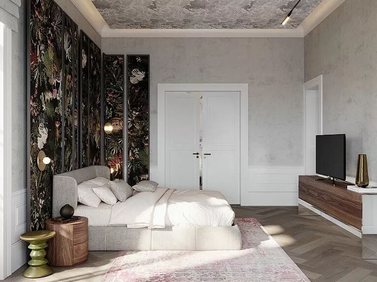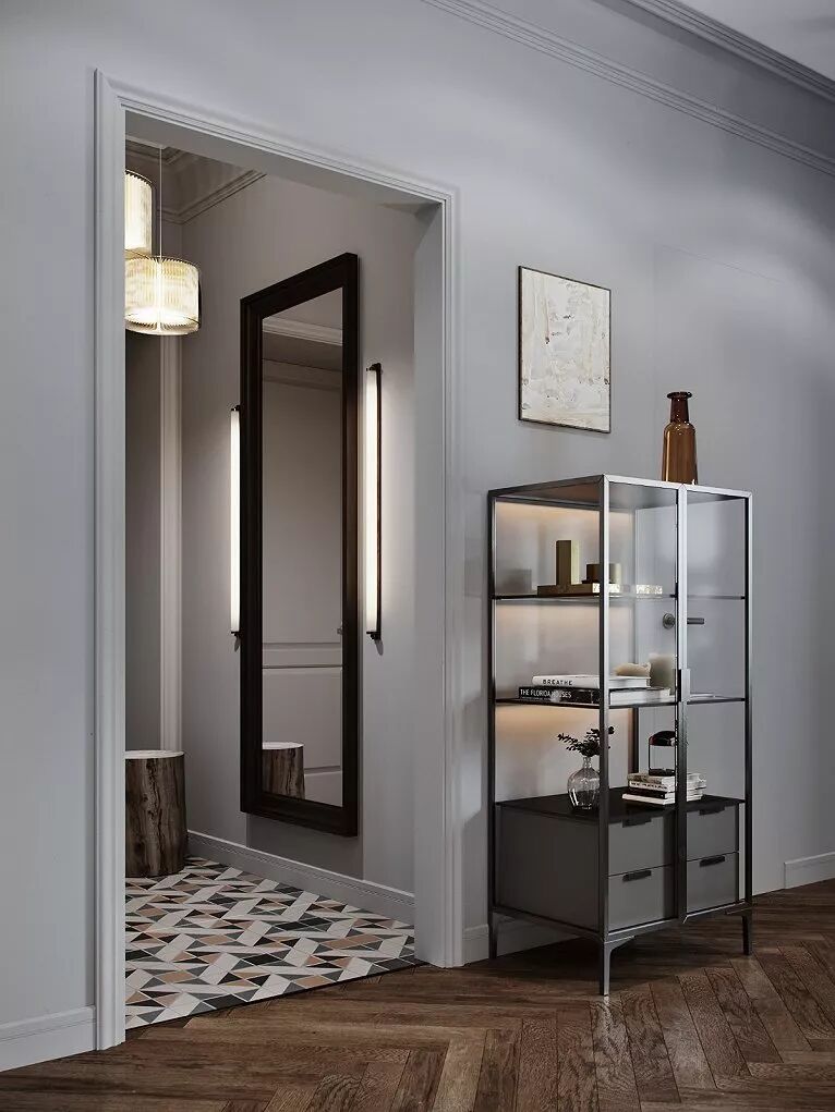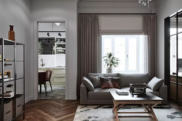 清浅的原木色人字拼花地板,让主色调稍深的空间变得通透,配合高雅灰、落地灯、鎏金装饰,浪漫清新之感扑面而来。