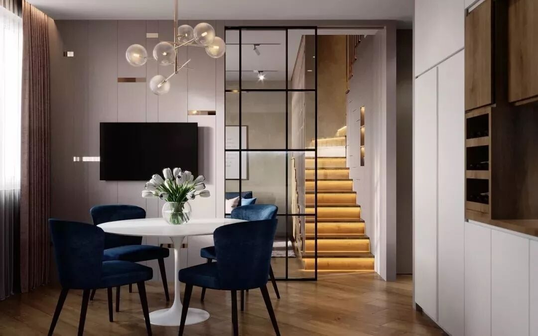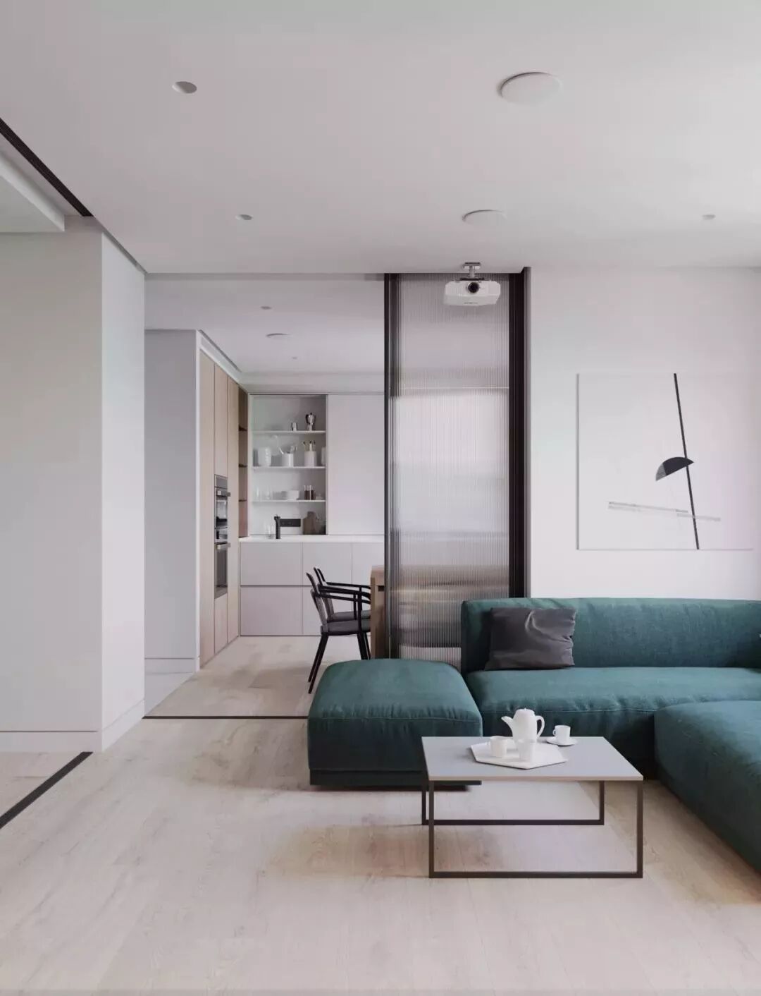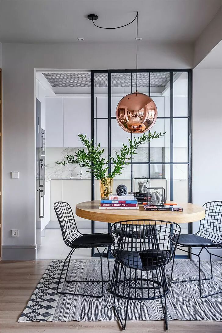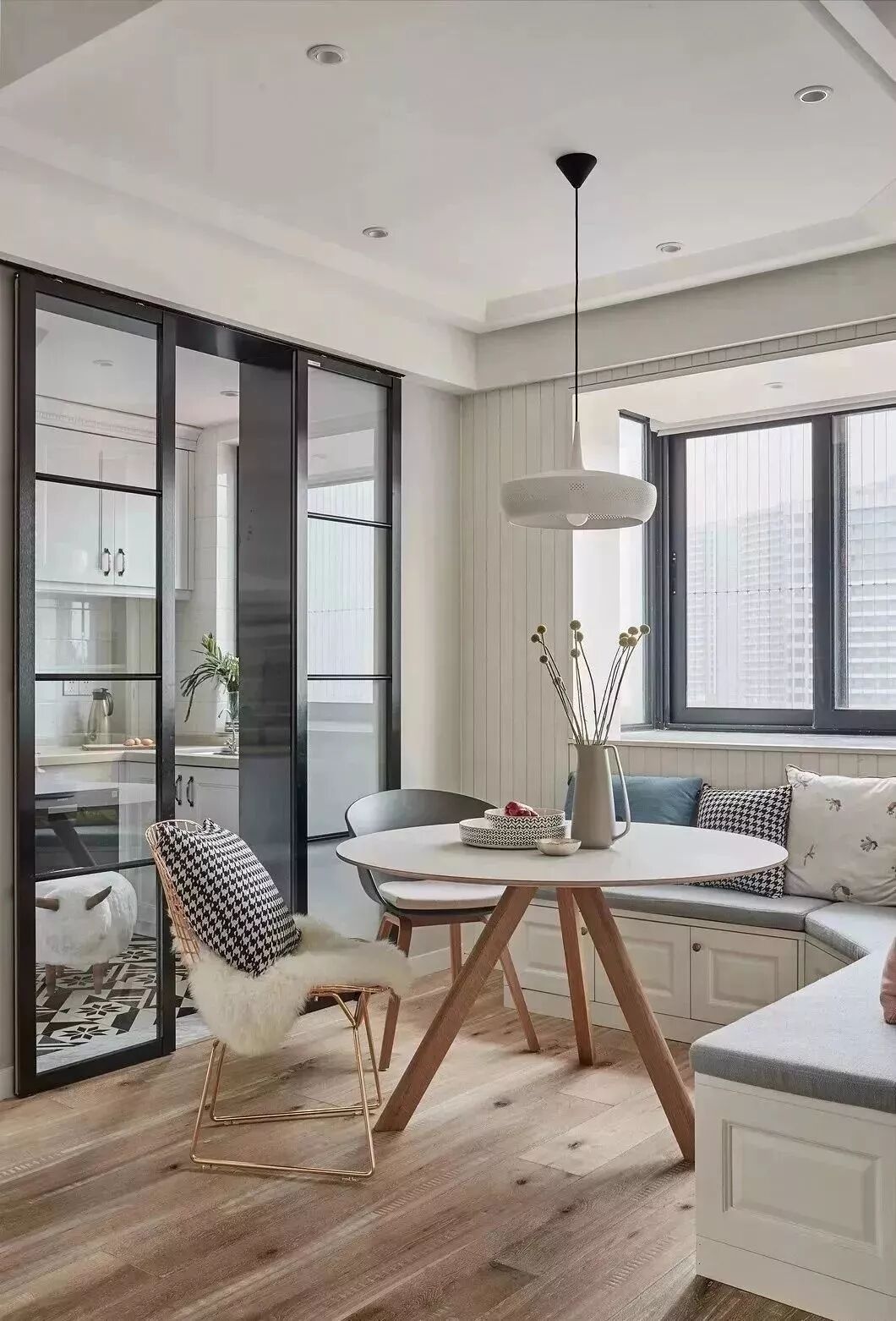 黑框+透明玻璃,这是当下的网红款,可以应用在非主墙的墙面,给人带来清凉感和通透感。特别适合于使用在厨房,隔而不断,打造半开放式空间,视野更为宽阔,采光效果也非常棒,让空间既有时尚美感,又有轻奢质感。