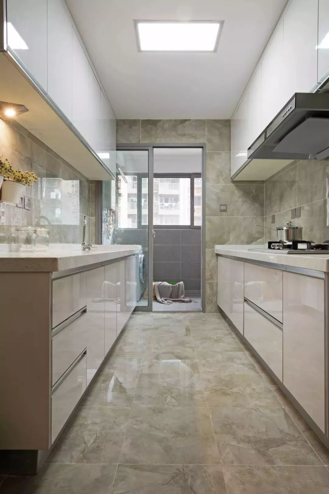 比较常见的就是把厨房外的小阳台作为生活阳台,和厨房用玻璃门隔开,保证光线的流通,又能避免油烟对衣服的影响。