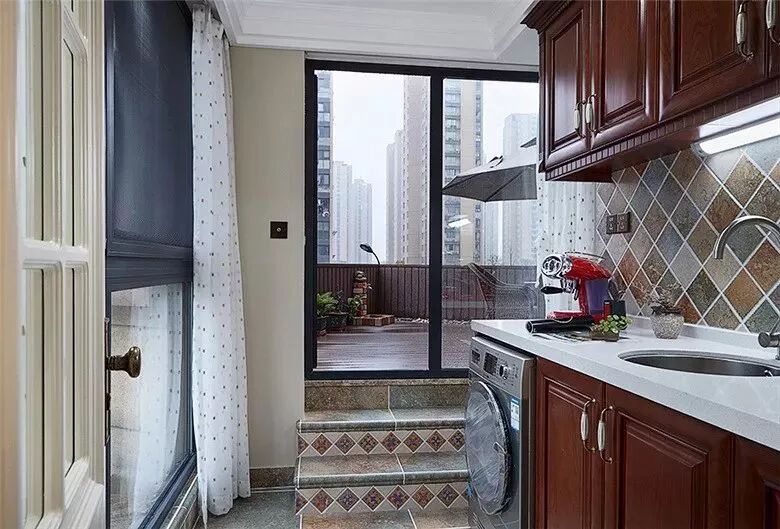 厨房外的小阳台摆放洗衣机,做个晾衣杆就非常实用了,这样客厅、卧室外的阳台就可以改成休闲阳台,让家里变得更美。