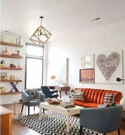 围合的轻松聊天环境沙发和扶手椅的摆位组合很适合聊天。另外,沙发和橘色休闲椅的加入让氛围更轻松活泼。