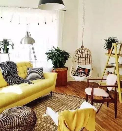 沙发是绿+白,靠垫也选用百搭的纯色黑白灰,那一个绿色靠垫就显得格外点睛,这样真的不会搭错,再搭配素色的地板,一点也不会抢戏!