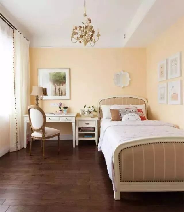 黄色是一种较为暖的色系,效果一般都比较温馨。不过卧室作为人休息的空间,建议不要选择过于深、刺眼的黄色,会让人神经兴奋,不宜于睡眠空间。黄色的墙面适合与深色的木地板搭配。