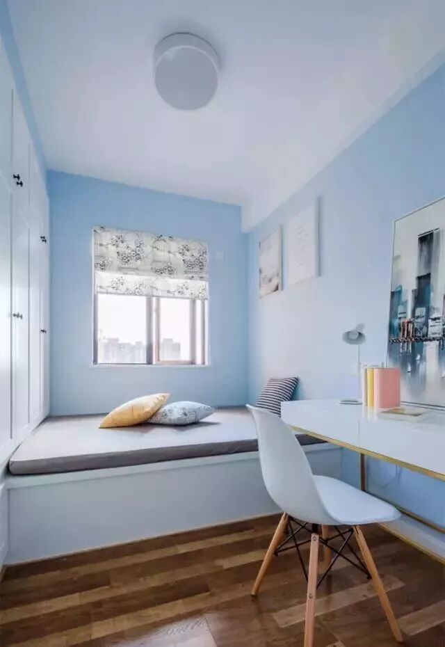 蓝色是一种比较安静清新的色调,可以搭配出一种独特的浪漫气息。蓝色墙面比较适合搭配浅色系木地板,深色系搭配较为突兀,需要谨慎选择。