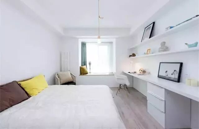 白色与原木色作为一种经典流传的搭配,是一种实用又耐看的组合;而且后期拓展也比较强,比如要装投影仪的时候,白墙可以直接投影,无需另外装幕布;如果纠结墙面什么颜色好的,干脆就刷白色简单又大方!