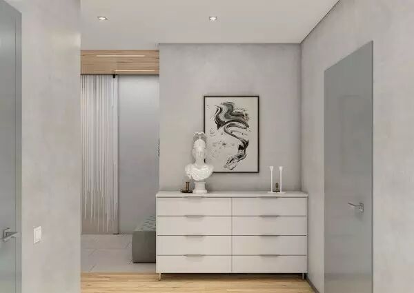 ▲在房间里一些无自然光的拐角处,主人用了白色家具和配饰来装饰这部分空间,配合灰色的墙壁和木色地板,简洁又大方。