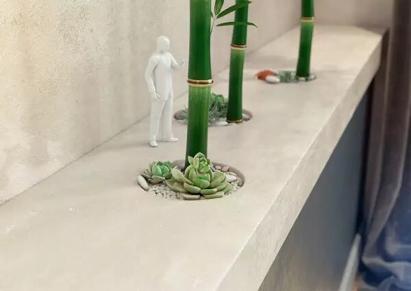 ▲卧室的细节也没有被忽略,而是用自然又充满趣味的方式来处理。比如床头平台处设计了“种植”植物的凹槽,并以白色鹅卵石来填充,配上多肉和竹子,以及一旁的人偶摆件,十分有趣。