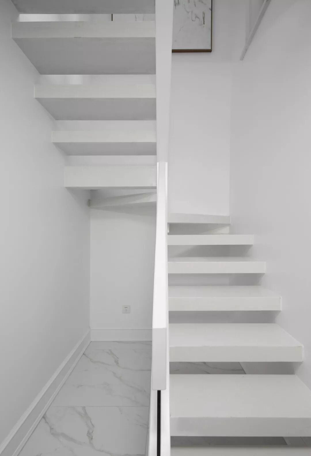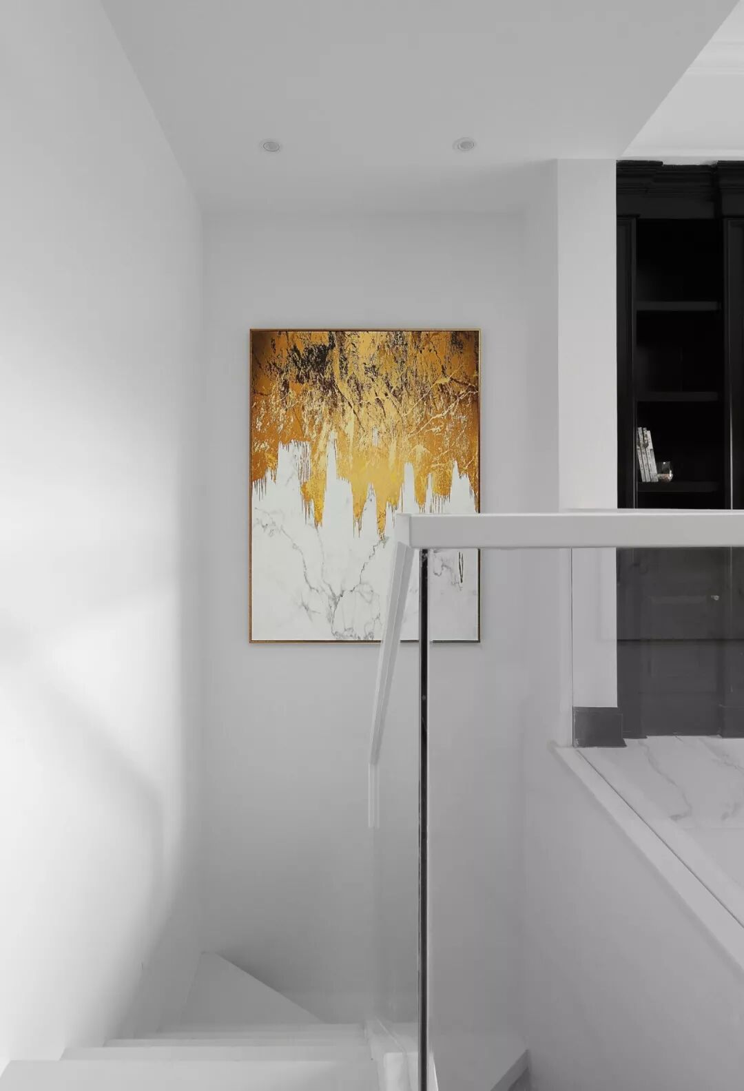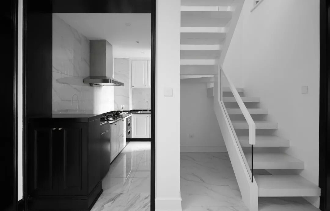 简洁镂空的楼梯设计,玻璃护栏和白色扶手,为这个黑白交错的空间增色不少,在楼梯目所能及处,均用橙色墙漆点缀,形成色彩的呼应,高级之外又似将人黑白淡漠的心里带入一抹骄阳的温暖。