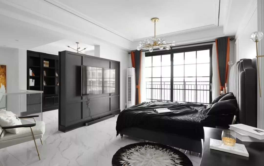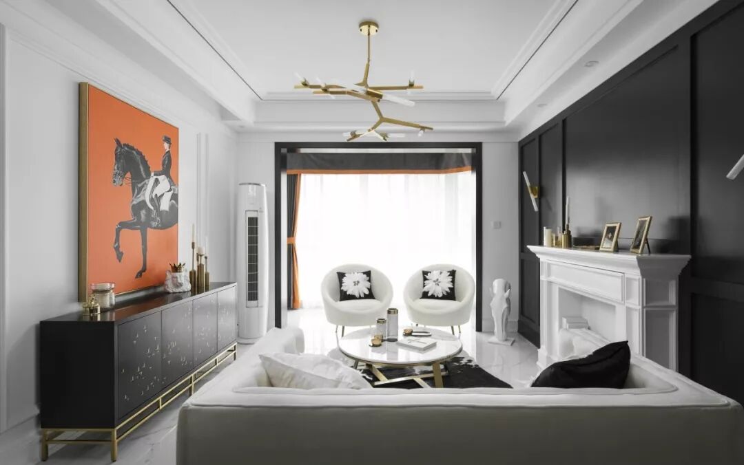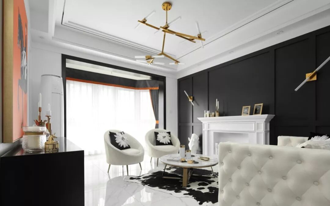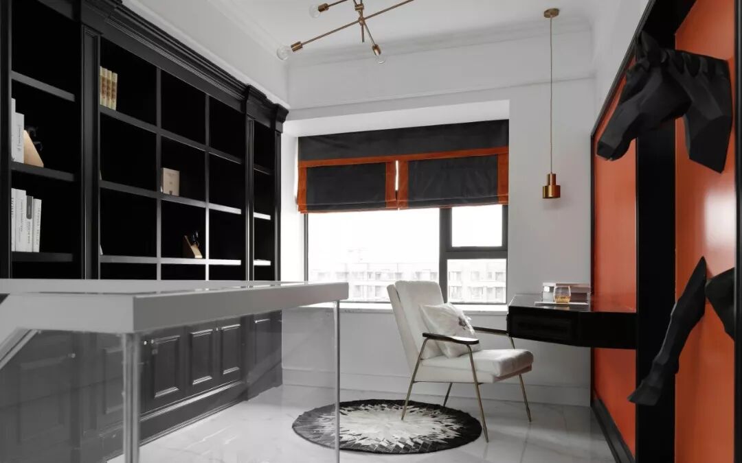 层次丰富的线条和看似低调却细节满满的轻奢空间结合,完整地勾勒出不平凡的独特,半亮光的黑色墙漆与三分光的白色墙面碰撞,搭配一抹香橙色,映衬出黑白空间不一样的趣味。