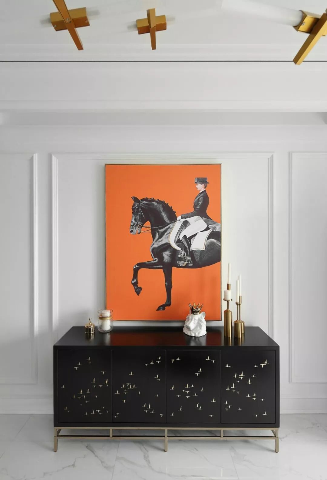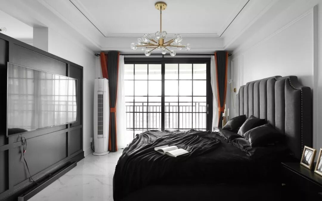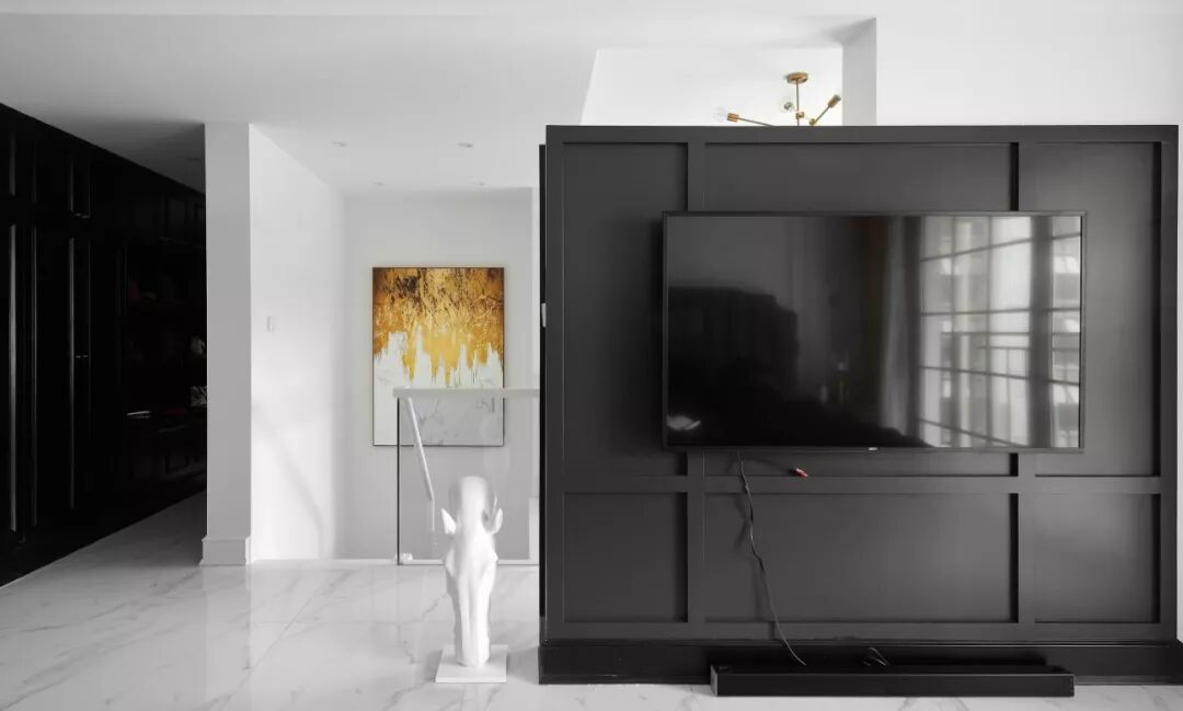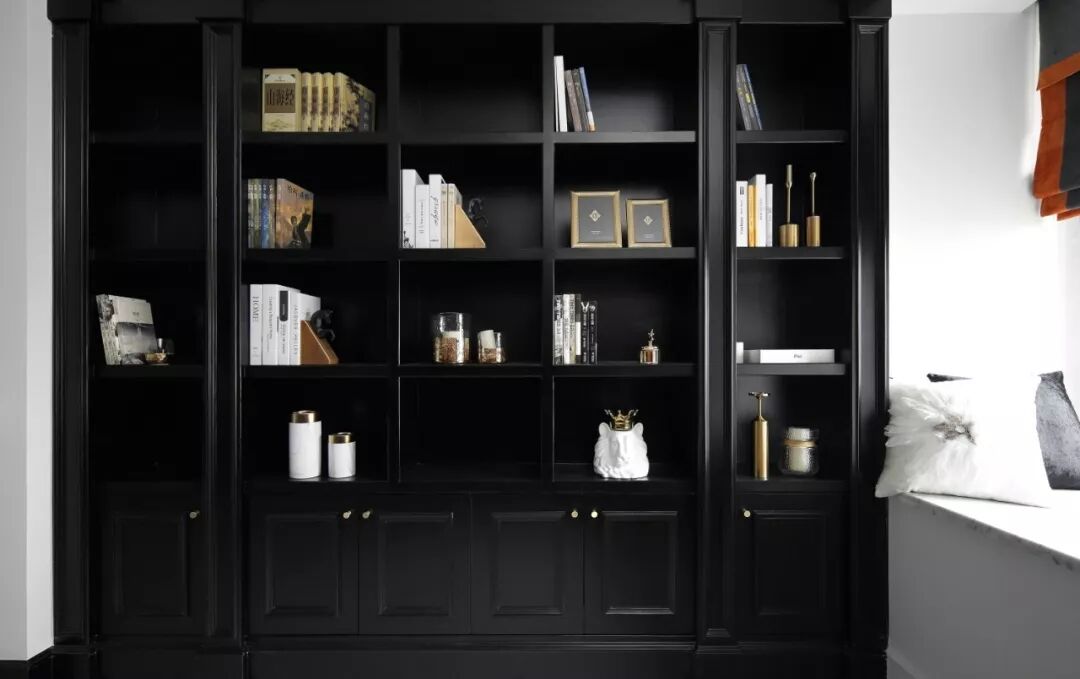层次丰富的线条和看似低调却细节满满的轻奢空间结合,完整地勾勒出不平凡的独特,半亮光的黑色墙漆与三分光的白色墙面碰撞,搭配一抹香橙色,映衬出黑白空间不一样的趣味。