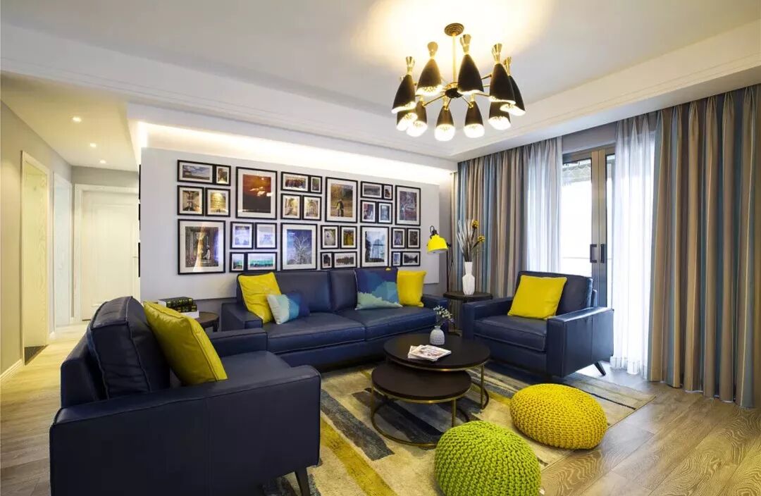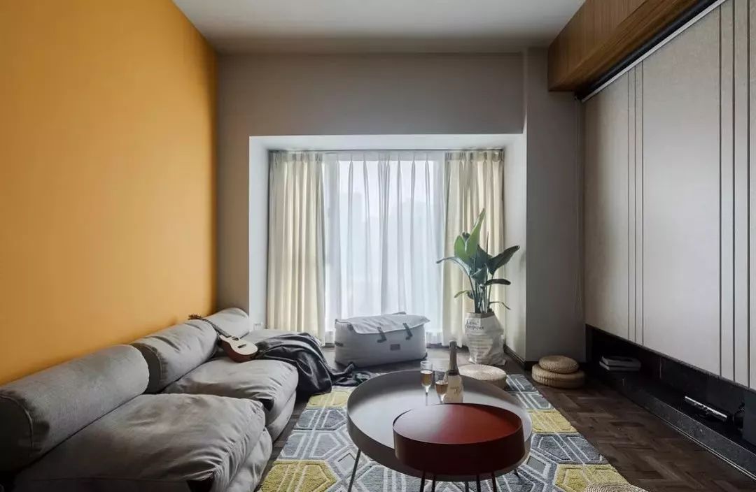 操作迷之简单,墙、地面、大家具使用黑白灰打底,然后选一个你最喜欢的颜色作为强调色,比如黄色,以小面积形式,如抱枕、茶几、装饰画等,反复的出现!