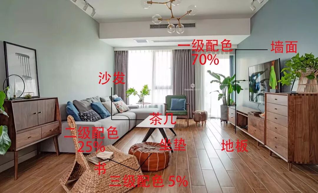这个配色比例不仅可以帮我们进行地板、墙面选色,还可以解答所有关于沙发、家具、窗帘的配色问题。
