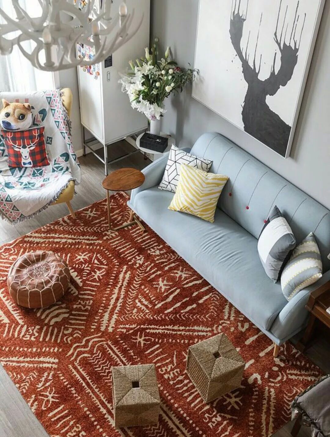 浅色地毯首选几何图纹,且面积要铺的大一些,才不容易和地板形成鲜明的反衬!