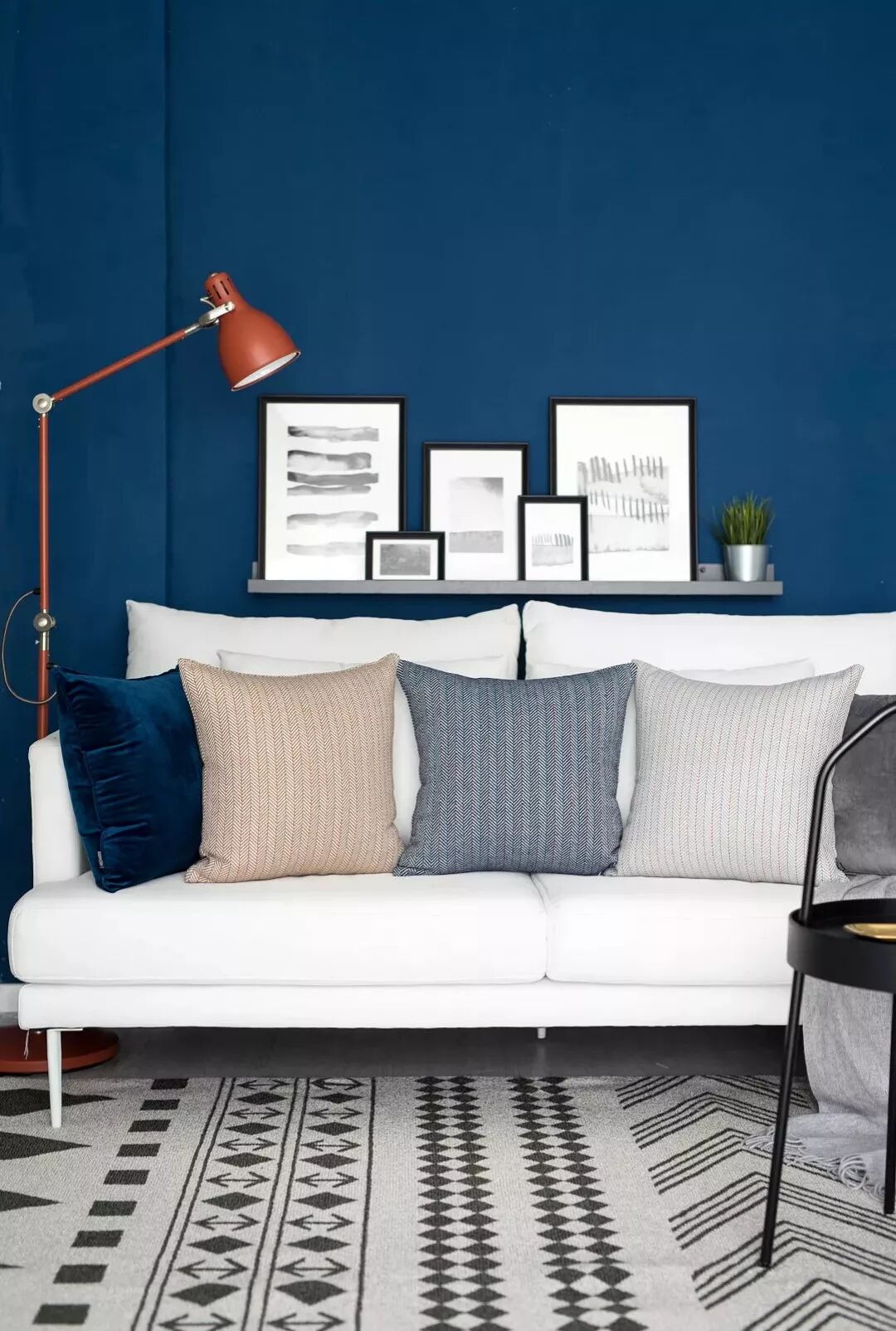 如果是小户型,但实在喜欢深蓝色的墙,可以换一个大地色或者浅色系沙发,就会明亮很多~