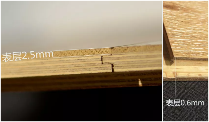表层厚度主要是考虑到纹理效果和耐磨问题,表层是决定纹理及肌理效果的一层,常见的多层地板表层有0.6mm、1mm、2.5mm等。较厚的耐久性较好,且足以支撑各类肌理效果的实现,而0.6mm的只能做成纯平面。