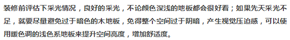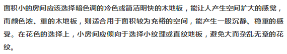 色彩能影响视觉空间感,不同的色彩会造成不一样的视觉效果,明亮暖色有扩张作用,冷色、暗色则有压缩效果,因此,选购木地板前,要考虑面积大小。