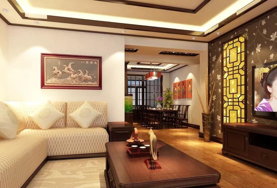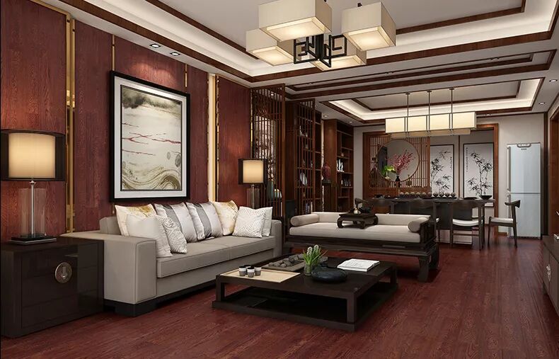 新中式风格装修一般以红棕色,红色,黄色,深棕色为主,还有部分家庭为了配合装修选择黑胡桃色的地板。