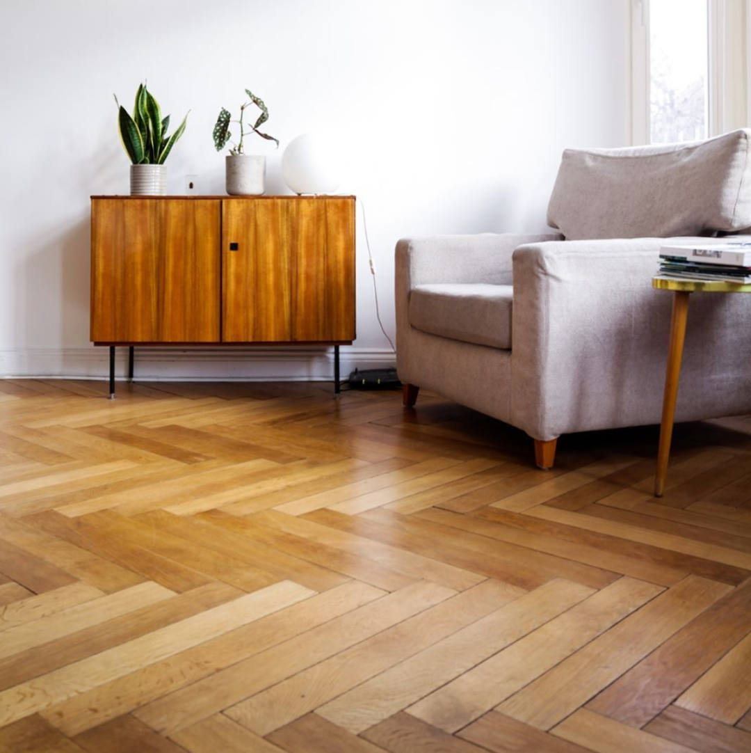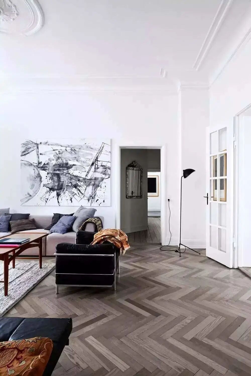 采用人字拼的形式,地板尺寸不能过大,小一点比较精致。同时,地板颜色的深浅不一,能让空间更有层次感,使地板从"小透明"变成亮点。