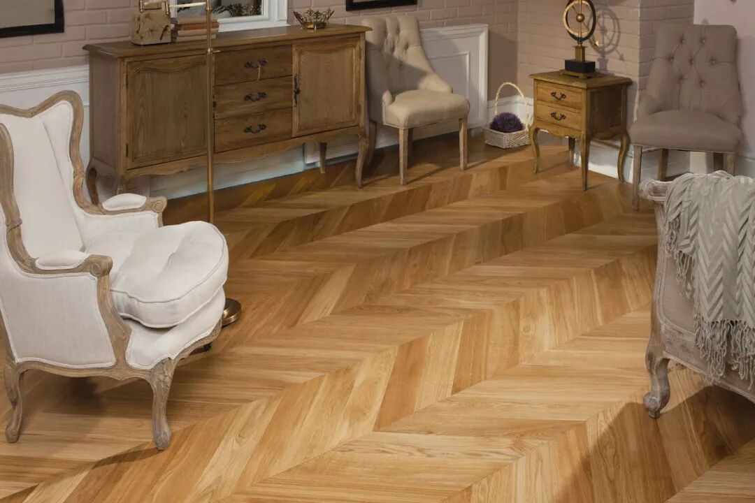 若想追求颜值且板材损耗率低,人字拼的方式比较合适。地板不用裁切,将两块地板按90°直角对接的形式,形成"人"字状。只需在四周和墙壁交接处要切掉一部分的地板,损材率远远低于鱼骨拼。