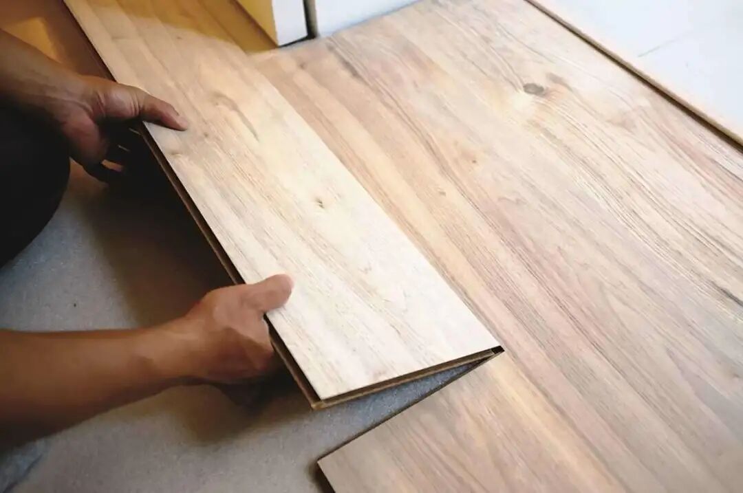 2.下一块板放平斜着朝第一块板推。继续用同样的方法把整个第一排铺完。