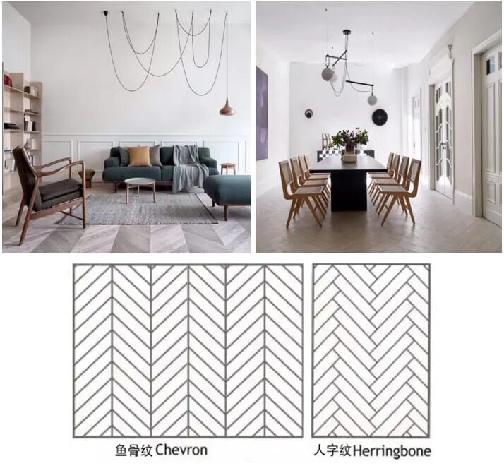 鱼骨拼的特点就是两块平行四边形地板拼出 V 字型,人字拼则是长方形地板交错拼出人字型。